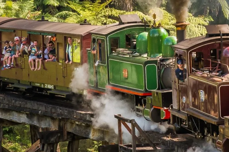 Enjoy a scenic journey through the Dandenong Ranges on an open-carriage steam train, with the thrill of dangling your legs over the sides as you pass through forests, valleys, and historic bridges.